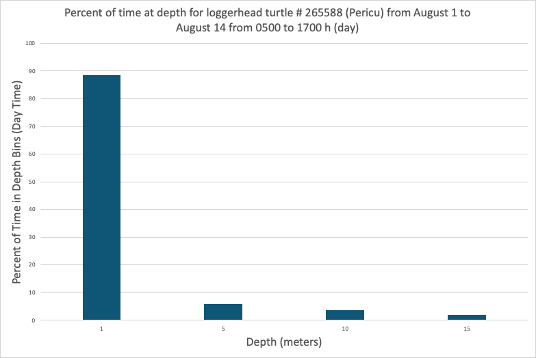 Three of our juvenile loggerheads are equipped with special satellite tags from Wildlife Computers that log and transmit various behavioral parameters (time at temperature, time at depth, maximum dive depth and dive duration). Below are three sets of graphs showing water temperature preferences and percent of time spent at various depth bins. If you have any questions, please send a note to loggerheadstretch@gmail.com